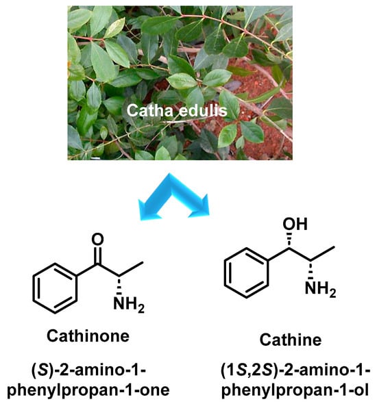 Cathinone is a naturally occurring stimulant found in the leaves of the khat plant (Catha edulis), which is native to the Horn of Africa and parts of the Arabian Peninsula. In these regions, khat consumption is deeply embedded in cultural and social traditions and is often consumed by chewing or as tea [1,2]. Over time, this practice has also spread to Europe and North America. The active constituents of fresh khat leaves include a variety of alkaloids, flavonoids, amino acids, glycosides, sterols, vitamins and minerals [3,4].
