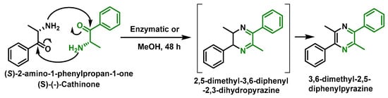 (S)-(−)-cathinone can be dimerized to produce 3,6-dimethyl-2,5-diphenylpyrazine, making it difficult to purify and isolate [8] (Figure 2).