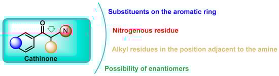 Chemical modifications and functional group substitutions of the cathinone structure have resulted in a large number of new synthetic cathinone psychostimulants, the number of structural modifications has been growing, making them the second largest group of new psychoactive substances in Europe [5,33]. The chemical structure of cathinones allows for numerous modifications, resulting in a wide variety of synthetic derivatives [34] (Figure 4).