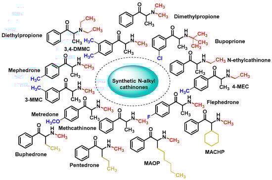 The first generation of synthetic cathinones, the N-alkyl cathinones, comprises compounds with one or no substituents on the aromatic ring and/or alkyl substitutions on the α-carbon of the side chain [36] (Figure 5).
