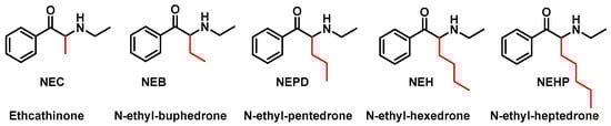In 2023, Nadal-Gratacós et al. synthesized and studied the in vitro and in vivo effects of five N-ethyl-substituted cathinones that differ only in the length of the alpha-carbon side chain. They are N-ethyl-cathinone (NEC), N-ethyl-bufedrone (NEB), N-ethyl-pentedrone, N-ethyl-hexedrone (NEH) and N-ethyl-heptedrone and they are able to inhibit dopamine uptake and are selective for dopamine transport [48] (Figure 6).