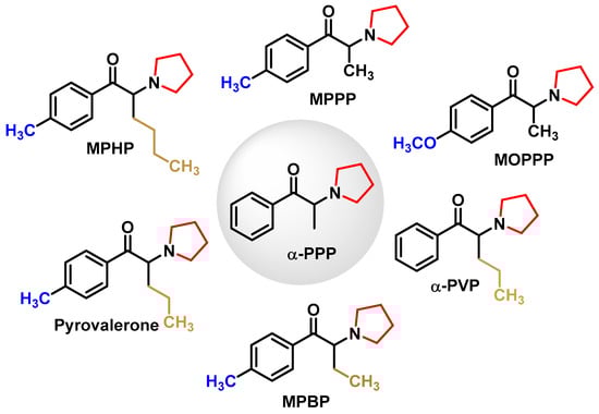 N-pyrrolidine cathinones have a pyrrolidine ring, a side chain with different numbers of carbon atoms at the alpha position and monosubstitution in the aromatic ring [51] (Figure 7).