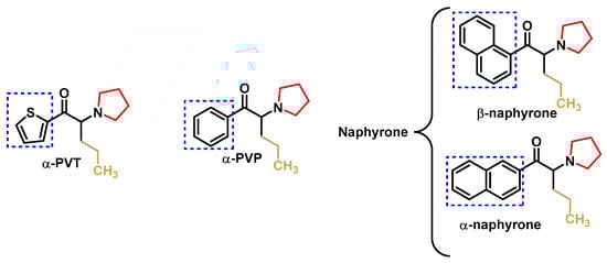 The replacement of the phenyl ring in α-PVP with other aromatic rings, such as thiophene, provided alpha-pyrrolidinopenthiothiothiophenone (α-PVT) or the naphthalene known as naphyrone (naphthylpyrovalerone, O-2482), which is a mixture of alpha and beta isomers and not just the β isomer, as described in the literature [56] (Figure 8).
