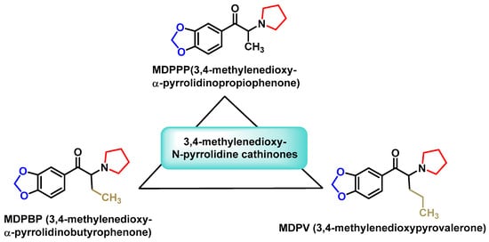 This group combines the structural features of a 3,4-methylenedioxy ring with an N-pyrrolidinyl unit (Figure 9). One of the best-known substances in this category is 3,4-MDPV, a compound first synthesized in 1969 for the treatment of chronic fatigue. Despite its medicinal origin, 3,4-MDPV quickly became notorious for its high potential for abuse and dependence [58].