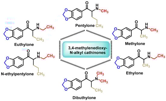 These derivatives are characterized by the presence of a 3,4-methylenedioxy group attached to the aromatic ring and alkyl substitutions on the nitrogen atom (Figure 10). Methylone, one of the first synthetic cathinones in this category, was initially synthesized in 1996 as an antidepressant and anti-Parkinson’s drug, but was never marketed for medical use [63].