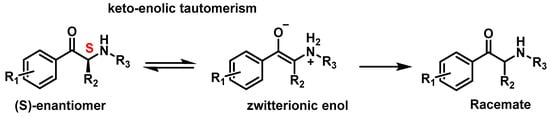 Cathinones possess a stereocenter, making them chiral molecules, which means they exist as two enantiomers (R and S forms). These enantiomers can exhibit different potencies and affinities toward their pharmacological targets. In biological systems, such as the human body, enantiomers often display distinct activities and vary in the intensity of their effects [65]. Typically, one enantiomer may be more pharmacologically active, while the other may contribute to adverse effects or even higher toxicity. Despite this, most synthetic cathinones (SCs) are distributed as racemic mixtures, containing equal amounts of both enantiomers. Additionally, racemization between enantiomeric forms can occur through keto–enol tautomerism [35,65] (Figure 11).