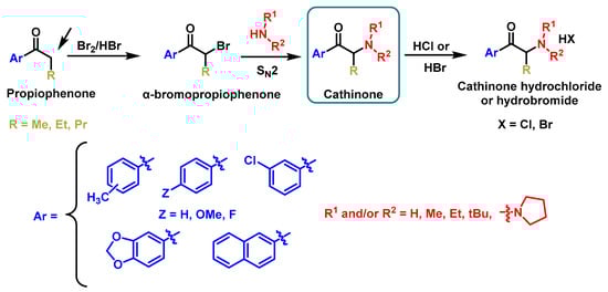 Synthetic cathinones are typically produced in racemic mixtures, where both enantiomers are present in equal proportions [75]. Their synthesis in the laboratory is straightforward and generally involves the following methods: