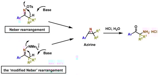 In the modified Neber rearrangement, the process involves quaternary hydrazones rather than oximes [80]. The final step, as with the standard Neber rearrangement, involves treatment with acid to form the α-aminoketone, which is then isolated as a hydrochloride salt [81,82,83,84,85,86] (Figure 13).