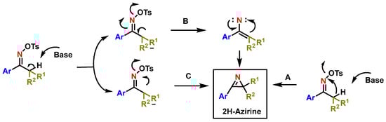 The mechanism for 2H-azirine formation is not fully understood, with three proposed pathways involving either a concerted process (A pathway) or an intermediate aza-allyl anion leading to 2H-azirine via a vinyl-nitrene (B pathway) or a carbon–nitrogen bond (C pathway) (Figure 14).