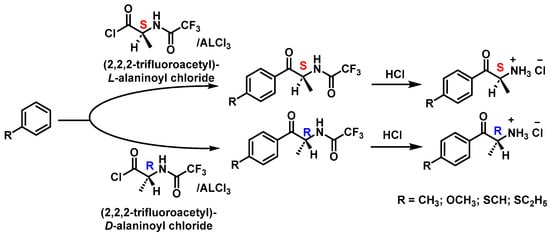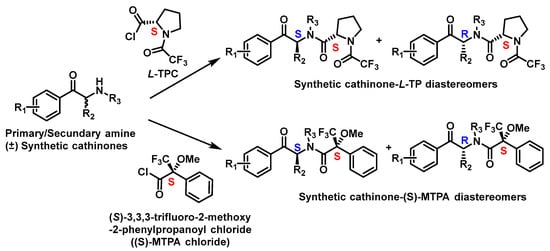 - Mohr, S.; Weiß, J.A.; Spreitz, J.; Schmid, M.G. Chiral separation of new cathinone- and amphetamine-related designer drugs by gas chromatography-mass spectrometry using trifluoroacetyl-l-prolyl chloride as chiral derivatization reagent. J. Chromatogr. A 2012, 1269, 352–359. [Google Scholar] [CrossRef]