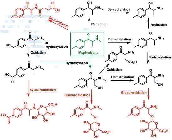 - Pozo, Ó.J.; Ibáñez, M.; Sancho, J.V.; Lahoz-Beneytez, J.; Farré, M.; Papaseit, E.; de la Torre, R.; Hernández, F. Mass spectrometric evaluation of mephedrone in vivo human metabolism: Identification of phase I and phase II metabolites, including a novel succinyl conjugate. Drug Metab. Dispos. 2015, 43, 248–257. [Google Scholar] [CrossRef]