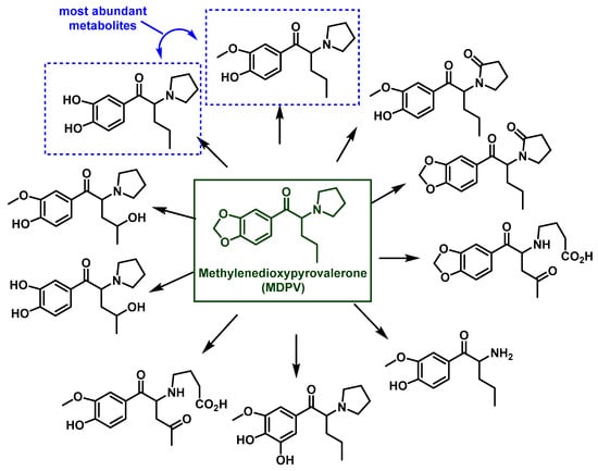 - Zaitsu, K. Metabolism of synthetic cathinones. In Synthetic Cathinones: Novel Addictive and Stimulatory Psychoactive Substances; Springer: Cham, Switzerland, 2018; pp. 71–96. [Google Scholar]