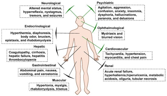 - Tyrkkö, E.; Andersson, M.; Kronstrand, R. The Toxicology of New Psychoactive Substances: Synthetic Cathinones and Phenylethylamines. Ther. Drug Monit. 2016, 38, 190–216. [Google Scholar] [CrossRef] [PubMed]