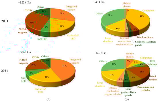 Structure of gallium consumption in (a) semi-products and (b) final products based on global gallium flows in 2001 and 2021 taken from [15].