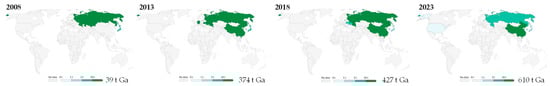 Global changes in gallium primary production over the last fifteen years: gallium production levels (in tons) by country in 2008, 2013, 2018 and 2023 [25].