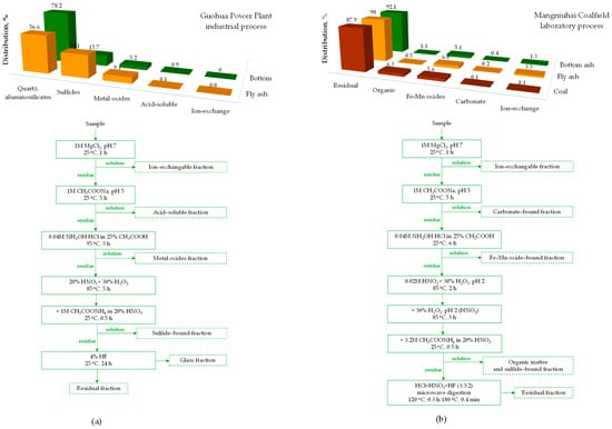 Gallium in coals exhibits a complex nature of occurrence, as its association with multi-mineral and/or organic materials has been observed in coals from different geological periods and with varying gallium concentrations [36,46,49,96,97]. Gallium often correlates positively with ash yield [43,53,55,60,73,82], suggesting that its occurrence is predominantly associated with inorganic matter, primarily aluminum and/or aluminosilicate minerals due to isomorphic aluminum substitution [43,47,55,93,96,98], as well as sulfide minerals such as pyrite and sphalerite [46,55,62]. Depletion of ash suggests an association of the element with organic matter [55]. As a result, conclusions on gallium speciation are predominantly based on statistical correlations with other elements/oxides (e.g., Al, Si, S) [46,53,55,57,62,89,99] or correlation coefficients with ash yield [53,54,55,100]. Sequential leaching methods, which determine the distribution of gallium among silicate (or residual), organic and/or sulfide (oxidizable), carbonate (or acid-soluble), iron–manganese oxide (or reducible), ion-exchangeable, and water-soluble forms, are used less frequently [45,101,102], despite their ability to quantify gallium distribution among individual fractions. Advanced multiscale in situ investigation techniques (e.g., Backscattered Electron-Energy-Dispersive X-ray Spectroscopy (BSE–EDS), Electron Microprobe Analysis (EMPA) mapping, Laser Ablation Inductively Coupled Plasma Mass Spectrometry (LA–ICP–MS)) provide more detailed insights, identifying modes of occurrence of trace elements, such as gallium enrichment within gelatinous components of macerals in the organic matter of coal [95,97].