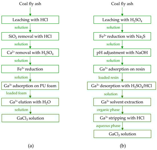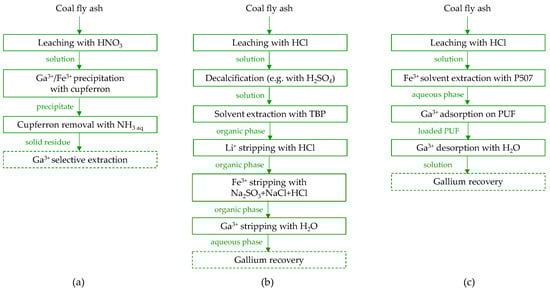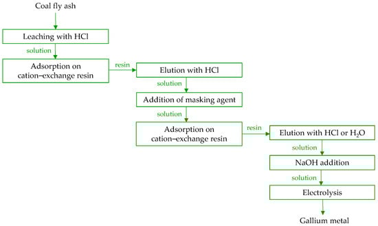 There are no research studies on direct hydrometallurgical recovery of gallium from coal. However, Zou et al. [104] reported an extraction procedure from gallium-enriched tuff in a coal-bearing strata-hosted rare metal deposit at the Zhongliangshan mine, China. The sample consisted mainly of kaolinite, pyrite, anatase, and jarosite. The following steps were applied: (i) alkaline sintering at 860 °C for 30 min with anhydrous sodium carbonate, (ii) water immersion at 90 °C for 120 min, and (iii) acid leaching with 4 M HCl at 40 °C, at a solid-to-liquid ratio of 20:1. This resulted in a 93.4% recovery of gallium. Interestingly, water leaching alone achieved a recovery rate of 67.3%.
