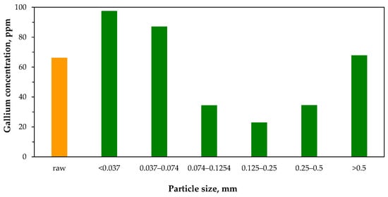 Bottom ash, on the other hand, makes up 10–20% of the total coal ash waste [109]. It consists of agglomerated particles that are too large to be carried into the flue gases, causing them to accumulate at the bottom of the coal furnace. This material is granular and highly porous (Figure 4b), with particle sizes reaching up to several dozen millimeters. The global annual production of coal bottom ash is estimated at 780 million tons, with 66% originating from Asian countries, followed by contributions from Europe and the USA [110]. Although both types of ash can be beneficially reused, their large percentages are still stored in landfills and ash ponds, leading to significant environmental concerns [105,109]. However, given gallium’s typical inorganic affinity in coal and its concentration in ashes, the latter appears to be a highly suitable feedstock for gallium recovery.