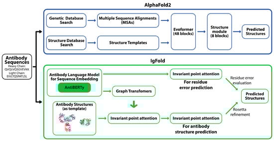 Models like AlphaFold2 and RoseTTAFold2 have revolutionized protein structure prediction by utilizing deep learning to predict protein structures with high precision. AlphaFold2 pipeline involves generating multiple sequence alignments and identifying homologous structures to capture evolutionary information, which is processed by a deep neural network (Evoformer) to predict inter-residue relationships (Figure 1) [11]. These predictions are then used to assemble and refine a high-accuracy 3D model of the protein. Although AlphaFold models have reinvented general protein structure prediction, antibodies present unique challenges due to their highly variable complementarity-determining regions (CDRs) essential for antigen binding. Specialized models like IgFold have been developed for antibody structure prediction [16]. IgFold leverages embeddings from AntiBERTy, a language model pre-trained on 558 million natural antibody sequences [33], and utilizes graph neural networks to directly predict antibody backbone atom coordinates with remarkable speed and accuracy, completing predictions in under 25 s (Figure 1). IgFold outperforms traditional homology models and matches or surpasses AlphaFold in specific antibody-specific tasks due to the captured intricate residue relationships. IgFold also offers enhanced flexibility, including robust incorporation of template structures and support for nanobody modeling.