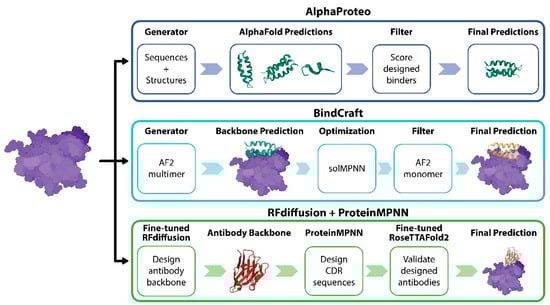 Machine learning models have been used to predict the binder of target proteins. AlphaProteo and BindCraft are leading general protein binder prediction models (Figure 2) [35,36]. AlphaProteo comprises a generative model trained on structural and sequence data from the Protein Data Bank (PDB), a distilled set of AlphaFold predictions, and a filtering mechanism that scores and selects predicted designs (Figure 2). By inputting target protein sequences, AlphaProteo can generate many candidate binders, and then the model filters low-quality binders. The model achieved experimental success rates ranging from 9% to 88%. BindCraft, an open-source and automated protein binder design pipeline, utilized the AlphaFold2 multimer to design high-affinity binders without complicated filtering, even when binding sites are unknown (Figure 2). Based on the 10 experimentally validated binders, BindCraft has a success rate of 10–100%.