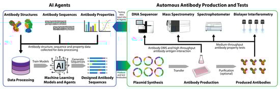 This schematic represents an end-to-end, machine learning agent-powered autonomous platform for antibody design, production, and testing. AI agents trained to generate optimized antibody candidates process antibody structures, sequences, and property data. High-throughput experimental systems (DNA sequencers, mass spectrometry, spectrophotometers, and biolayer interferometry) test antibody properties, which feed back into AI models for further optimization. Antibody production and purification systems allow for scalable synthesis and testing of AI agent-generated antibodies, facilitating an iterative pipeline that accelerates discovery and optimizes binding and developability.