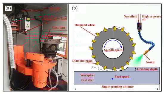 The grinding experiment was conducted using a self-made robotic automatic platform (Figure 1a) which was mainly composed of a 5-DOF robot arm, robot controller, servo motor, spindle, diamond wheel, MQL system, etc. The revolute joint of the robot arm was equipped with the harmonic reducer (T-355, Tokyo, Japan) and was driven by a servo motor (MGMF132L1H6M, Tokyo, Japan) operating in the current control mode. The robot arm was controlled by an industrial controller (LNC Technology Co., Ltd., R8800D3, Taizhong, China) with a handling capacity of 20 kg and 1.0 m reach. Before the grinding process, the operator applied teach-playback operating mode to teach the contours of the cast part to the robot. Subsequently, the robotic platform automatically grabbed the cast part and ground it along a contour on the diamond wheel. Therefore, it has high flexibility and is suitable for grinding cast parts with various morphological characteristics.
