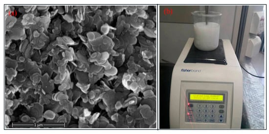 The MQL system was composed of an air compressor, pressure regulator, flow meter, and application nozzle. As shown in Figure 1b, the MQL nanofluid was applied through the nozzle positioned 40 mm away from the cut zone. As shown in Figure 2a, the hBN exhibited a typical two-dimensional layer sheet-like structure with a diameter in the range of several hundred nanometers. In this study, the preparation process of the hBN nanofluid was as follows: firstly, the hBN and sodium dodecyl sulfate with mass fractions of 0.2%, 1%, respectively, were thoroughly mixed in the deionized water by magnetic stirring for 1 h; subsequently, the mixture was subjected to ultrasonic vibration for 30 min (40 kHz, 60 W, Figure 2b) to avoid agglomeration and deposition. Although the hBN tends to aggregate, the hBN nanofluid was still stable after resting for 24 h.