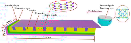 The water-based hBN nanofliud was mainly composed of water molecules and the hBN. According previous simulation reports [27,28], water molecules can effectively absorb grinding heat and reduce grinding temperature, but they cannot change the contact state between the workpiece surface and diamond grain. On the other hand, the flake of hBN was an excellent lubricant and can reduce the friction force. So, this section mainly explores the wear inhibition effect of hBN on diamond grain. It is well known that the abrasive grain presents a large negative rake angle to the workpiece, and the negative rake angle of cutting tool can effectively influence the material removal or deformation mechanisms [29]. During the grinding process, only a very small fraction (18%) of the grains merely rub or plow into the work material and even a smaller fraction (1.8%) of that participate in actual shearing [30]. Moreover, unlike turning or milling, it was difficult to confirm the accurate value of the negative rake angle of the diamond grain. Based on the above consideration, this paper simplified diamond grains to the shapes of hemispheres and cylinders. The large-scale atomic/molecular massively parallel simulator (LAMMPS) [31] and the OVITO [32] were applied to simulate and visualize the grinding process, respectively. The grinding model was shown in Figure 3 with lattice directions of x [100], y [010], and z [001], respectively. The workpiece was comprised of two lattices: orthorhombic lattice of cementite and body-centered cubic lattice of iron, due to the fact that the cast steel was mainly composed of pearlite and ferrite, and the diamond grain was composed of carbon with diamond cubic lattice. The workpiece matrix was divided into three regions: a boundary layer, a constant temperature layer, and a newton layer. Similarly, the abrasive grain was divided into two regions: the newton layer and the boundary layer. The atoms at the boundary layer were fixed so that the diamond grain and workpiece did not deviate from the preset position. The atoms in the thermostatic layer were set to a temperature of 300 K to dissipate the heat generated by grinding. The atoms at the newton layer were set as deformable body to study the grinding process. When grinding ferrous metal, the main causes of wear of the diamond grain were atom diffuses and lattice transformations [10,11]. Restricted by computing power, the molecular dynamics simulation can only evaluate the grinding process from the atomic and molecular levels (nm) [33]; therefore, this paper scaled back the diamond grain to the nanometer level, which was shown in Table 1. This scaling to the nanoscale cannot affect the analysis of atomic diffusion, lattice transition, temperature, stress, and material removal. Before the grinding process, the initial workpiece was relaxed to accomplish the thermal equilibrium state and diminish excess energy of the whole system under the isobaric-isothermal ensemble (NVE) at a temperature of 300 K in 120 ps.