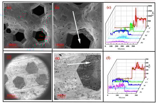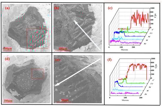 The morphology and element distribution (along white arrow) of diamond grain after water-based spray (a–c), and water-based hBN spray (d–f).