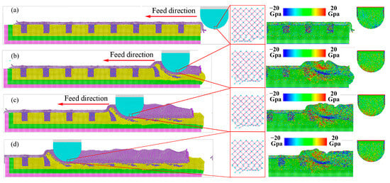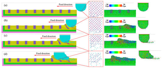 Dynamic evolution of dry grinding under different grinding distance: (a) 0 nm, (b) 8.5 nm, (c) 14.5 nm, (d) 20.5 nm.