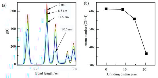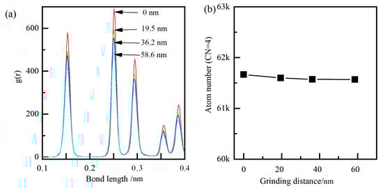 The radial distribution function (RDF) was a primary linkage between macroscopic thermodynamic properties and intermolecular interactions. After grinding, the RDF of diamond grain and hBN are shown in Figure 13c,d. The peaks of standard hBN (at 0.1449, 0.2511, and 0.2899 nm) corresponded to the nearest neighbor distance of B-N, B-B/N-N, B-N, respectively. After grinding, the peak position had almost no change, and the peak width was broadened, indicating that the hBN was a stable phase and no phase transformation under large plastic deformation occured. The main peak positions of standard diamond were 0.154, 0.251, and 0.295 nm, corresponding to the near neighbor distance. After dry grinding, the peak position shifted from 0.154 nm to the left 0.142 nm, indicating that the diamond content had decreased to a certain extent, while the newly formed graphite content had increased. After lubrication of hBN, the peak position showed almost no change, and the peak width was broadened, indicating no phase transformation. Based on the above analysis, the diffusion and chemical wear of diamond grain can be suppressed under the lubrication of hBN.