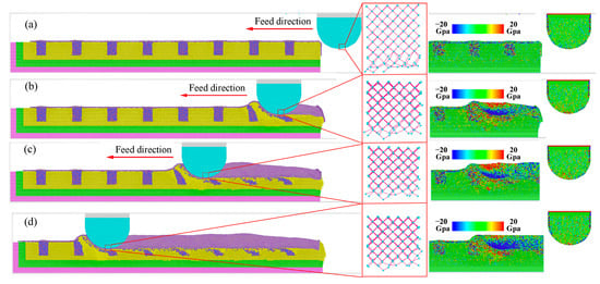 The grinding process under a single layer of hBN is shown in Figure 9. Before grinding, the single layer of hBN showed good flexibility and strength [38]. It can be adsorbed on the surface of workpiece through Pauli repulsion and van der Waals forces after the relaxation processes [39], which are shown in Figure 9a. After coming into contact with each other (Figure 9c,d), the workpiece experienced severe plastic deformation, and the diamond grain showed slightly elastic deformation, which was similar to that of dry grinding. It was fairly well established that the material removal of grinding manifested in two forms: plowing and shearing [29]. As shown in Figure 9b,c, some of the workpiece atoms were extruded to the front and side region of the abrasive grain to form ridges, while more atoms were compressed into the workpiece to form grooves. The material removal only shows the plowing, and the shearing did not appear. The main reason for the absence of shearing was that the cutting depth is much smaller than the diameter of diamond grain, and the effective negative rake angle was larger.