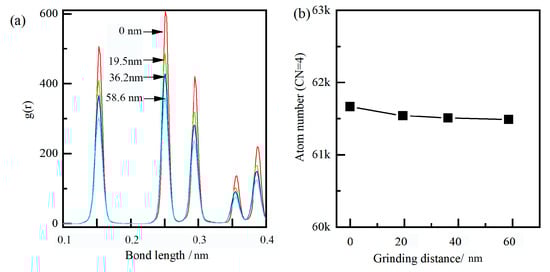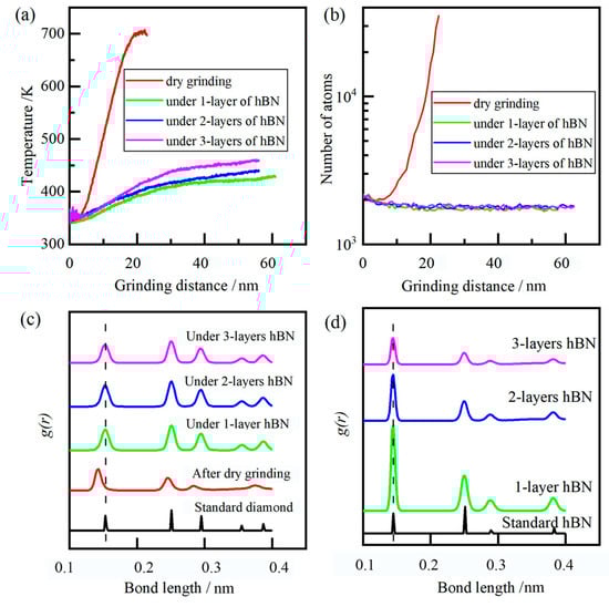 In the thermodynamics field, temperature was a measure of the average kinetic energy of the atom inside the diamond grain and was also an important indicator for evaluating the processing quality. As shown in Figure 13a, during dry grinding, with the increase in grinding distance, the temperature of the diamond grain rapidly grew from 300 K to 700 K. The increase in grinding temperature mainly came from the plastic deformation in the contact zone, especially the formation of hexagonal lattice, which lead to a large amount of heat generation. Higher kinetic energy could cause the C-C bond break and lead to the diffusion wear of diamond grain. When the temperature reached 700 K, the atom of diamond grain generated intense thermal motion, and its covalent bond was changed from sigma-bond to pi-bond, resulting the chemical wear of diamond grain. Under the lubrication of hBN, the temperature of diamond grain grew slowly from about 300 K to 450 K with the increase in grinding distance. This was mainly due to the flake of hBN having weakened the interatomic forces between the diamond grain and workpiece and slowed down the phonon transfer from workpiece to diamond. The temperature of diamond grain slowly grew with the increase in the number of layers of hBN.