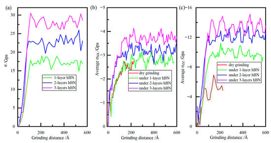 During the grinding process, the hBN around the contact zone underwent serious deformation, and von Mises stress was applied to evaluate its deformation behavior, which was shown in Figure 14a. With the advancement of abrasive grain, the value of stress first increased rapidly and then tended to be stable. The stress of hBN increased with the increase in hBN layer, due to the increase in effective grinding depth. During the grinding process, the hBN maintained the hexagonal lattice due to the stress being lower than its tensile strength (100 GPa), which agreed with Figure 11d. The average stress components of diamond grain were shown in Figure 14b,c, where σxx and σzz were the normal stresses in the x and z directions. Evident from Figure 14, the σxx and σzz was lower than zero, indicating a compressive stress, which was consistent with the situation of extrusion removal. With the advancement of abrasive grain, the value of σxx and σzz first increased rapidly and then tended to be stable. At the stable stage, the value of σxx and σzz showed a certain degree of fluctuation, mainly due to the composition of the hard phase of cementite and the soft phase of ferrite in the workpiece. Meanwhile, the value of σxx and σzz increased with the increased number of hBN layers, mainly because that the volume of removed material increased with the increase in effective grinding depth.