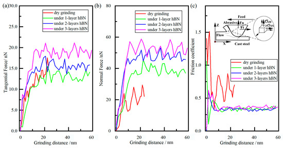 During the grinding process, the grinding force was generated by elastic deformation and plastic deformation, which is shown in Figure 15. Similarly to the stress trend, the tangential and normal forces first increased rapidly and then tended to be stable. The normal forces were much larger than the tangential force due to the large negative front angle of diamond grain, which was consist with previous reports [12]. As shown in Figure 15c, when the grinding condition changed from dry to lubricated, the value of the friction coefficient was decreased from approximately 0.5 to 0.25, indicating that the flake of hBN possessed good lubrication performance. From the above simulation analysis, the flake of hBN layer can not only suppress the chemical wear of diamond grain, but also decrease the friction force, which can be used to the grinding field.