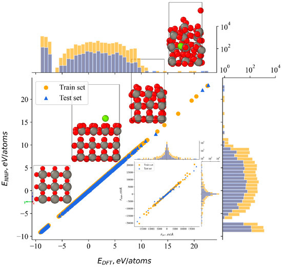 Correlation between DFT-calculated and NNP-predicted atomic energies, accompanied by two-dimensional histograms showing the distribution of these values. The subplot illustrates the correlation between reference and predicted forces using the same approach. Representative examples of structures from the training data are presented across the energy correlation points.