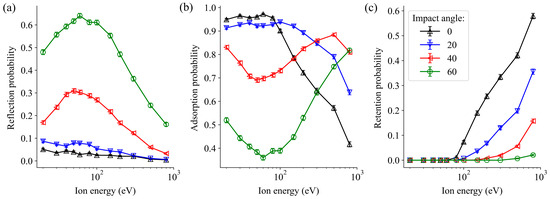 The peaks observed in the reflection and adsorption plots can be attributed to inelastic collisions between the incoming argon atoms and surface atoms. At lower (near-perpendicular) angles of incidence, collisions are less frequent, allowing the projectile to penetrate deeper into the surface layer. During these collisions, a portion of the kinetic energy of the incoming particle is transferred into heat or lattice vibrations. However, as the impact angle becomes flatter, the probability of collisions also becomes larger, as the length of the path passed by the Ar atoms per unit height increases compared to the perpendicular case. Consequently, there is greater energy transfer between the projectile and the sample surface at flat impact angles, leading to higher reflection and lower adsorption rates, as observed between 30 and 60 eV. Simultaneously, a decrease in reflection and adsorption is associated with a larger probability of retention, which rises at higher energies and at vertical impact angles, as is shown in Figure 3c.