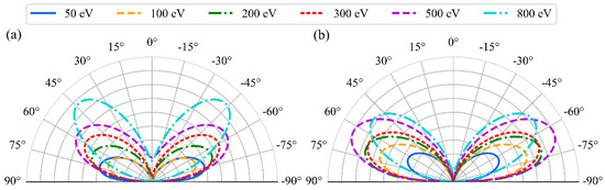 where A, B, a and b are fitting parameters. The angular distribution pattern and associated parameters change depending on the material, bombarding particle type, and energy. The fitted distributions are showed in Figure 4. In the polar plots, the radial axis represents the surface normal (the z-direction in the simulations), while the distance from the origin corresponds to the sputtering yield. The results are illustrated for six energies and for two angles, 0° and 60°, of the incoming Ar. A noticeable correlation is observed between the incoming and outgoing angles, as well as with the incident energy. At perpendicular impact, the peaks of the distributions shift to the smaller angles with an increasing incoming energy, from 70° at 50 eV to 45° at 800 eV. As the impact angle increases, the distributions become flatter; distributions at 20° and 40° are presented in the SI. At an impact angle of 60°, the peaks of all distributions change only slightly with the incoming angle and are located near 60°. The values of the fitted parameters in Equation (1) are provided in Table 1.