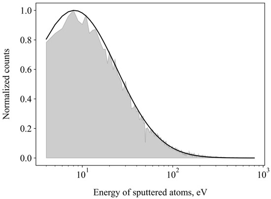 Besides deriving an analytical formula for the dependence of the sputtering yield on the kinetic energy and incident angle of argon particles, one can also analyze the energy spectra of the sputtered particles in order to predict an effective surface binding energy for the material [36]. The surface binding energy is the main parameter governing material interactions with irradiating particles. It represents the energy required to remove an atom from the surface and is such a key parameter in determining the stability of a material.