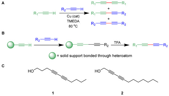 (A) Generalized Glaser–Hay reaction of terminal alkynes; (B) selective solid-supported Glaser–Hay reaction; (C) biologically active compounds from a previous study [26].