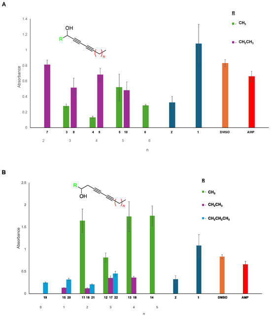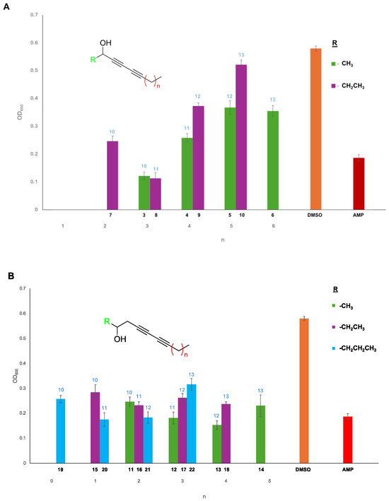Viability assay of E. coli grown in the presence of the secondary propargylic (A) and homopropargylic (B) diyne arrays. The OD600 was measured over 24 h to monitor bacterial growth, and the data were reported at the 8 h measurement time. All compounds were screened in triplicate, and plates were normalized to the DMSO (orange) positive control to allow comparison. Several compounds possessed greater bioactivity than a known E. coli inhibitor ampicillin (red). Variation in aliphatic chain length from the terminal alkyne (x-axis) and the alkynol component (R; color) confirmed that compounds ranging from 10 to 13 carbon units were optimal for bioactivity. Standard deviations of the measurements were generated from the replicates in Excel and plotted with the data. The number above the bar (light-blue font) indicates the number of carbon units in the compound.