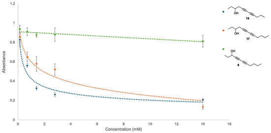One of the main methods of developing new biologically active antimicrobials is through exploring derivatives of natural products [6]. Among observed biologically active natural products, over 2500 contain at least two consecutive, conjugated alkynes (polyynes) [7,8,9,10,11,12,13], and new analogues continue to be discovered [14,15]. These polyynes exhibit a wide range of activities ranging from allelopathic [16] to butyrylcholinesterase (BChE) inhibitors [17] to antifungal and antimicrobial [18,19,20] and even potential anti-cancer drugs [21,22,23,24,25]. Based on these observations and a recently developed solid-supported Glaser–Hay synthetic methodology to rapidly generate polyynes asymmetrically, our previous research involved generating libraries of polyynes based on alkynes that also contain a primary alcohol moiety [26].