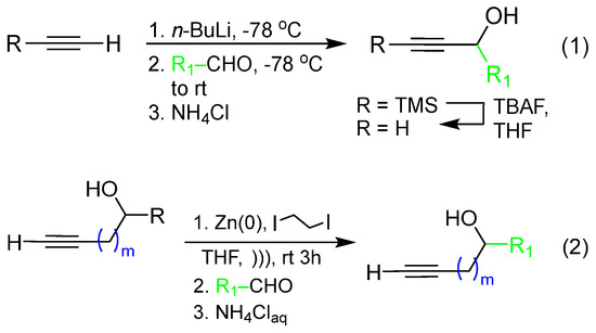 - Lee, A.S.-Y.; Chu, S.-F.; Chang, Y.-T.; Wang, S.-H. Synthesis of homopropargyl alcohols via sonochemical barbier-type reaction. Tetrahedron Lett. 2004, 45, 1551–1553. [Google Scholar] [CrossRef]