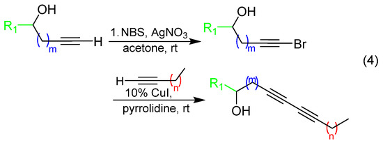 - Lampkowski, J.S.; Durham, C.E.; Padilla, M.S.; Young, D.D. Preparation of asymmetrical polyynes by a solid-supported glaser-hay reaction. Org. Biomol. Chem. 2015, 13, 424–427. [Google Scholar] [CrossRef] [PubMed]