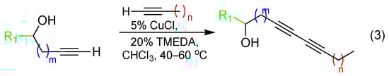 Copper (I) chloride (0.3 mmol, 0.05 equiv.) and N,N,N′,N′-Tetramethylethylenediamine (1.2 mmol, 0.2 equiv.) were added to 10 mL of CHCl3 and stirred for 10 min. The 1-alkyne (7.8 mmol, 1.3 equiv.) and alkynol (6.0 mmol, 1.0 equiv.) were then added to the solution in quick succession and heated to 60 °C for 18–24 h under oxygen. The reaction was then diluted with CHCl3 (ca. 10 mL), washed with a saturated solution of aqueous NH4Cl (ca. 3 × 15 mL), and dried with magnesium sulfate. Solvents were removed in vacuo, and the resulting product was purified via column chromatography on silica gel (20–30% ethyl acetate in hexanes). Molar quantities and isolated yields for pure compounds are shown in Table 1, as well as the Supporting Information [27].