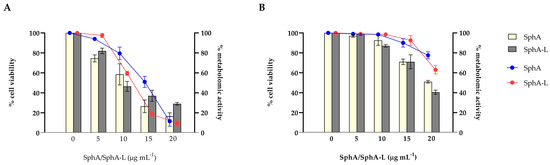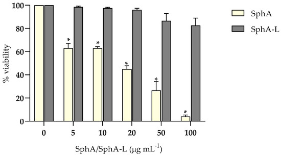 Cytotoxic effects of SphA and SphA-L on HaCaT cells, measured by MTT assay. Various concentrations of SphA and SphA-L (5 μg mL−1, 10 μg mL−1, 20 μg mL−1, 50 μg mL−1, and 100 μg mL−1) showed dose-dependent responses after a 24 h incubation period. Cell viability was measured at OD595 with means ± SDs (n = 3), and statistical significance is indicated by * p < 0.05, denoting significance when compared to the untreated cells (Tukey’s test).