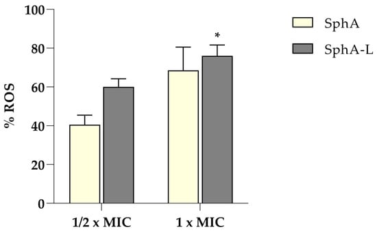 Susceptibility of C. auris to SphA and SphA-L induced intracellular ROS production. ROS production was assessed by cell staining with H2DCFDA. Data represents the means ± SDs of three independent experiments; statistical significant is indicated by * p < 0.05 (Tukey’s test).
