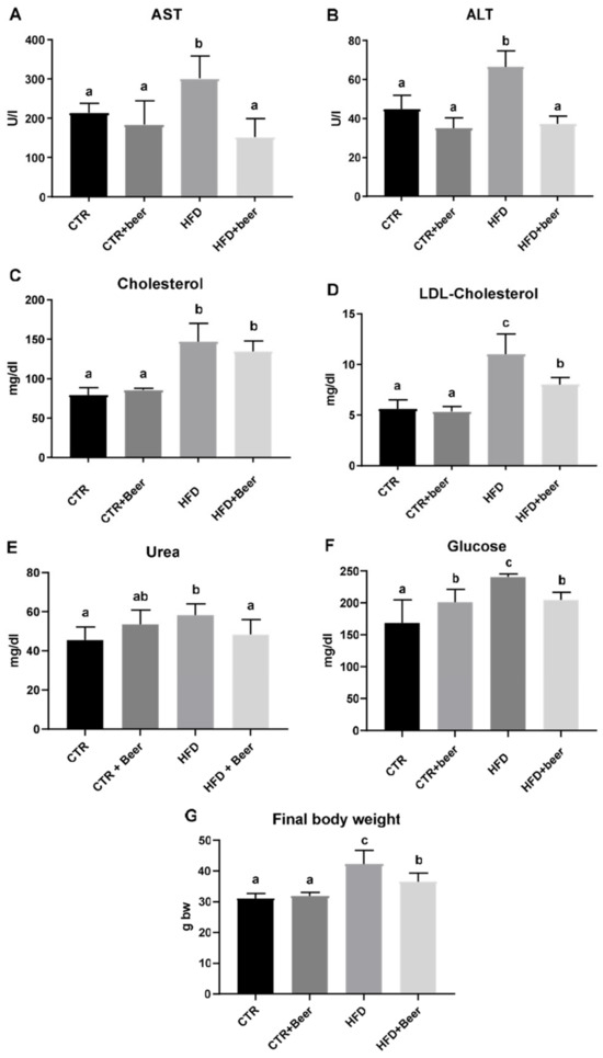 Biochemical parameters in the mouse serum (aspartate aminotransferase (AST) (A), alanine aminotransferase (ALT) (B), cholesterol (C), low-density lipoprotein (LDL)-cholesterol (D), urea (E), glucose (F)) and body weight at sacrifices (G) of CTR, CTR+beer, HFD and HFD+beer mice. Results are reported as means ± SD of three replicates. Values within each row with different letters (a, b, c) are significantly different according to one-way ANOVA (p ≤ 0.05) followed by Tukey’s post hoc test.