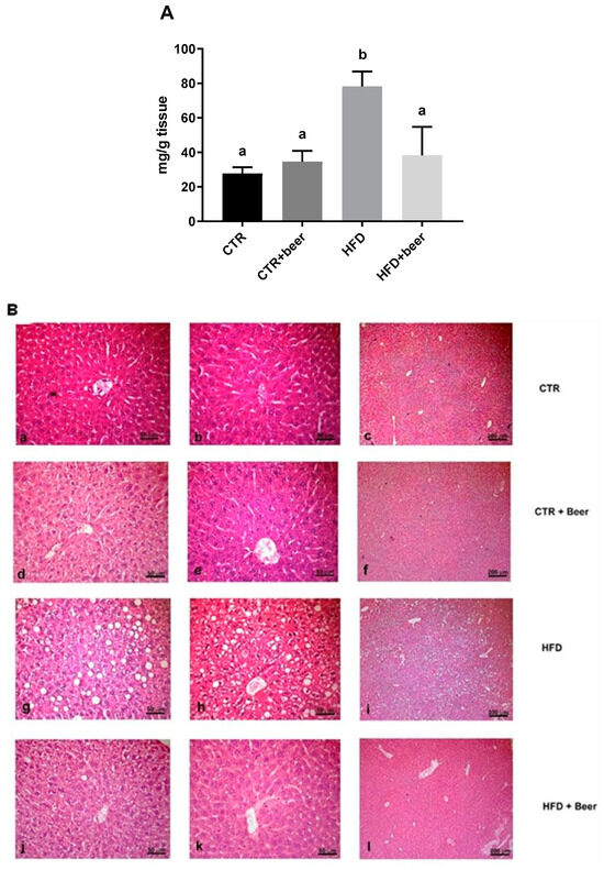 Total hepatic lipid content (A) measured in liver tissue from all CTR, CTR+beer, HFD and HFD + beer mice. Values are expressed as means ± SD. a, b: Values significantly different according to one way ANOVA-test (p ≤ 0.05) followed by Tukey’s post hoc test. Hematoxylin and eosin (H&E) staining (B) of liver tissue from CTR, CTR+beer, HFD and HFD+beer mice. Magnification: (a,b,d,e,g,h,j,k), bar = 50 µm; (c,f,i,l), bar = 200 µm.