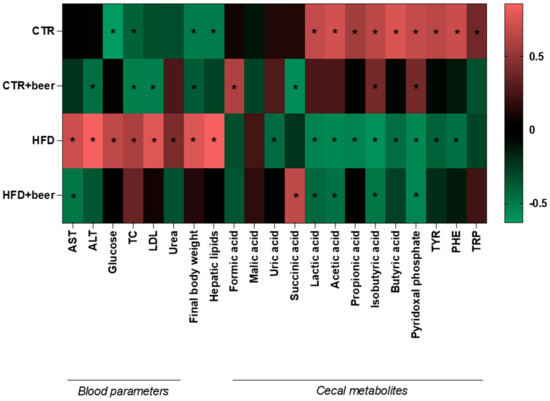 Pearson’s correlation coefficients were calculated to evaluate the relationships among the four different treatments to which the mice were exposed (CTR, CTR+beer, HFD, and HFD+beer) and several parameters, including blood biochemical parameters, final body weight, hepatic lipids, and metabolites in the cecal content. Interestingly, the CTR group was negatively correlated with glucose (r = −0.631), TC (r = −0.405), final body weight (r = −0.510), and hepatic lipids (r = −0.509) and positively correlated with lactic acid (r = 0.674), acetic acid (r = 0.724), propionic acid (r = 0.556), isobutyric acid (r = 0.647), butyric acid (r = 0.747), pyridoxal phosphate (r = 0.471), TYR (r = 0.642), PHE (r = 0.692), and TRP (r = 0.385). The CTR+beer group showed a negative correlation with ALT (r = −0.451), TC (r = −0.522), LDL (r = −0.519), final body weight (r = −0.372), and succinic acid (r = −0.578) and was positively correlated with formic acid (r = 0.597), isobutyric acid (r = 0.398), and pyridoxal phosphate (r = 0.400). The HFD group was negatively correlated with uric acid (r = −0.439), lactic acid (r = −0.539), acetic acid (r = −0.554), propionic acid (r = −0.539), isobutyric acid (r = −0.593), butyric acid (r = −0.453), pyridoxal phosphate (r = −0.559), TYR (r = −0.407), and PHE (r = −0.463) and positively correlated with AST (r = 0.706), ALT (r = 0.858), glucose (r = 0.649), TC (r = 0.582), LDL (r = 0.768), urea (r = 0.422), final body weight (r = 0.764), and hepatic lipids (r = 0.856). Finally, the HFD+beer group showed a negative correlation with AST (r = −0.483), lactic acid (r = −0.429), acetic acid (r = −0.466), isobutyric acid (r = −0.481), and pyridoxal phosphate (r = −0.541) and was positively correlated with succinic acid (r=0.654) (Figure 3 and Table S2).